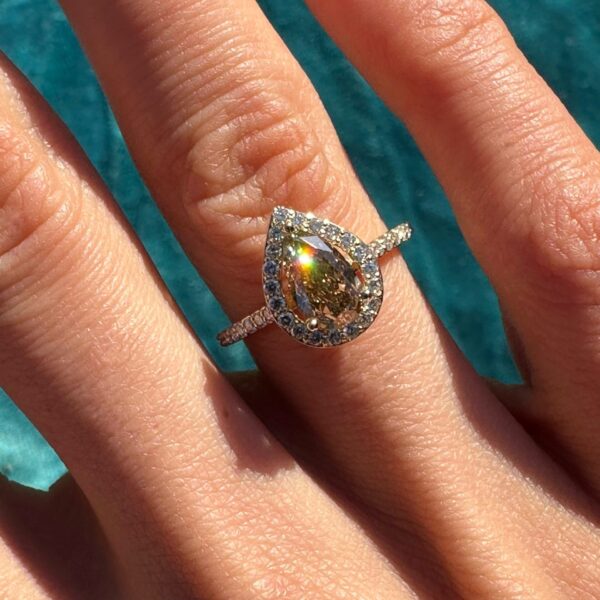 A luxurious 18-carat yellow gold ring featuring a natural yellow-brown diamond, beautifully surrounded by dazzling white diamonds.