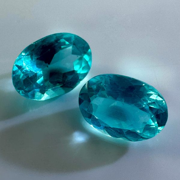 Very nice pair of Paraiba-type Blue Apatites. It is a rare variety, highly sought after for its color and transparency, which resembles the famous Paraiba Tourmaline. Great luminosity. Very good purchase choice.