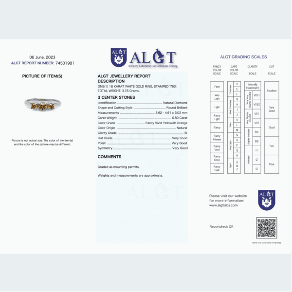 18K White Gold Ring with 0.80 ct Natural Fancy Vivid Yellowish Orange SI Diamond, ALGT Certified | Luxury Jewelry