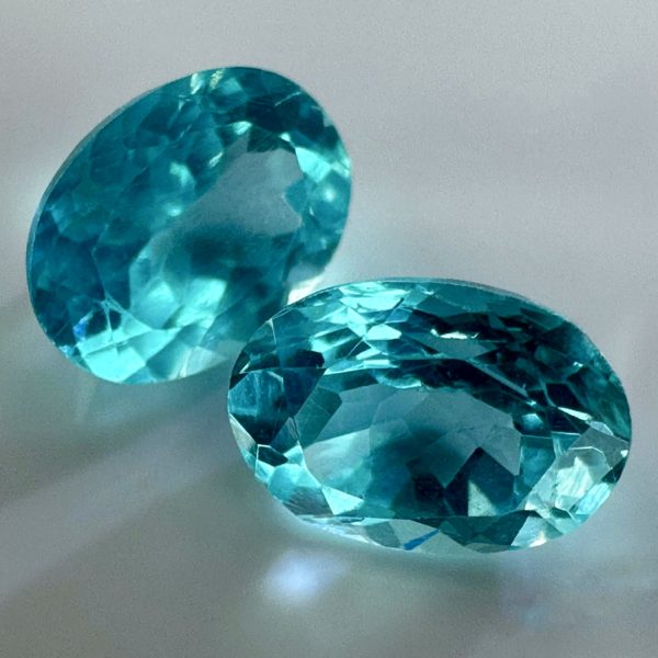 Very nice pair of Paraiba-type Blue Apatites. It is a rare variety, highly sought after for its color and transparency, which resembles the famous Paraiba Tourmaline. Great luminosity. Very good purchase choice.